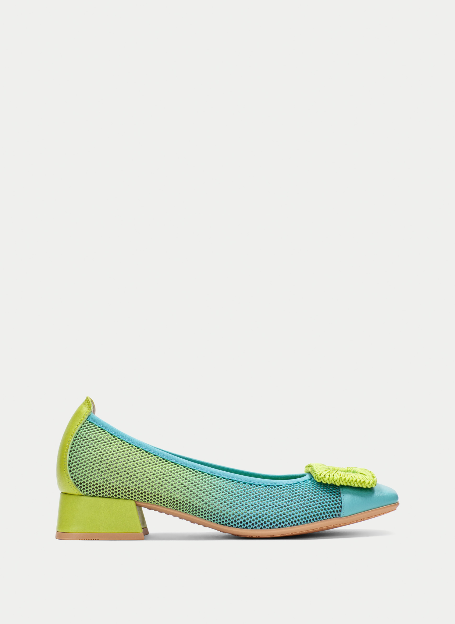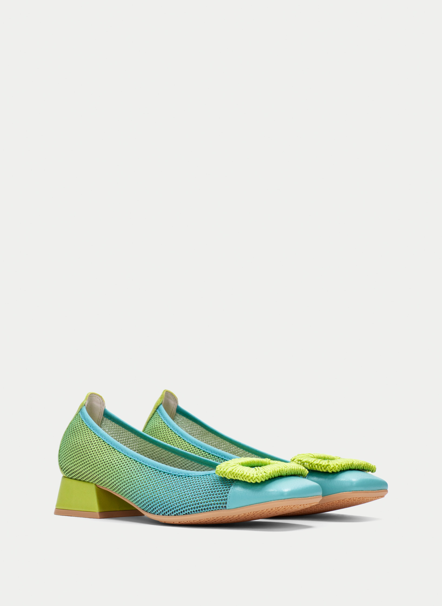 The shoe's design is easy to slip on, with no laces or fastenings, ensuring effortless style. The square block heel adds a modern touch, offering a medium height that provides both comfort and stability without sacrificing chic appeal. The heel is solid and clean, adding structure to the otherwise fluid design. Perfect for warm-weather outings, this shoe blends artistic flair with practical elegance, capturing the essence of a joyful, sunny day.