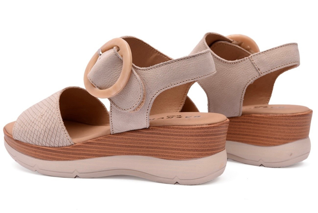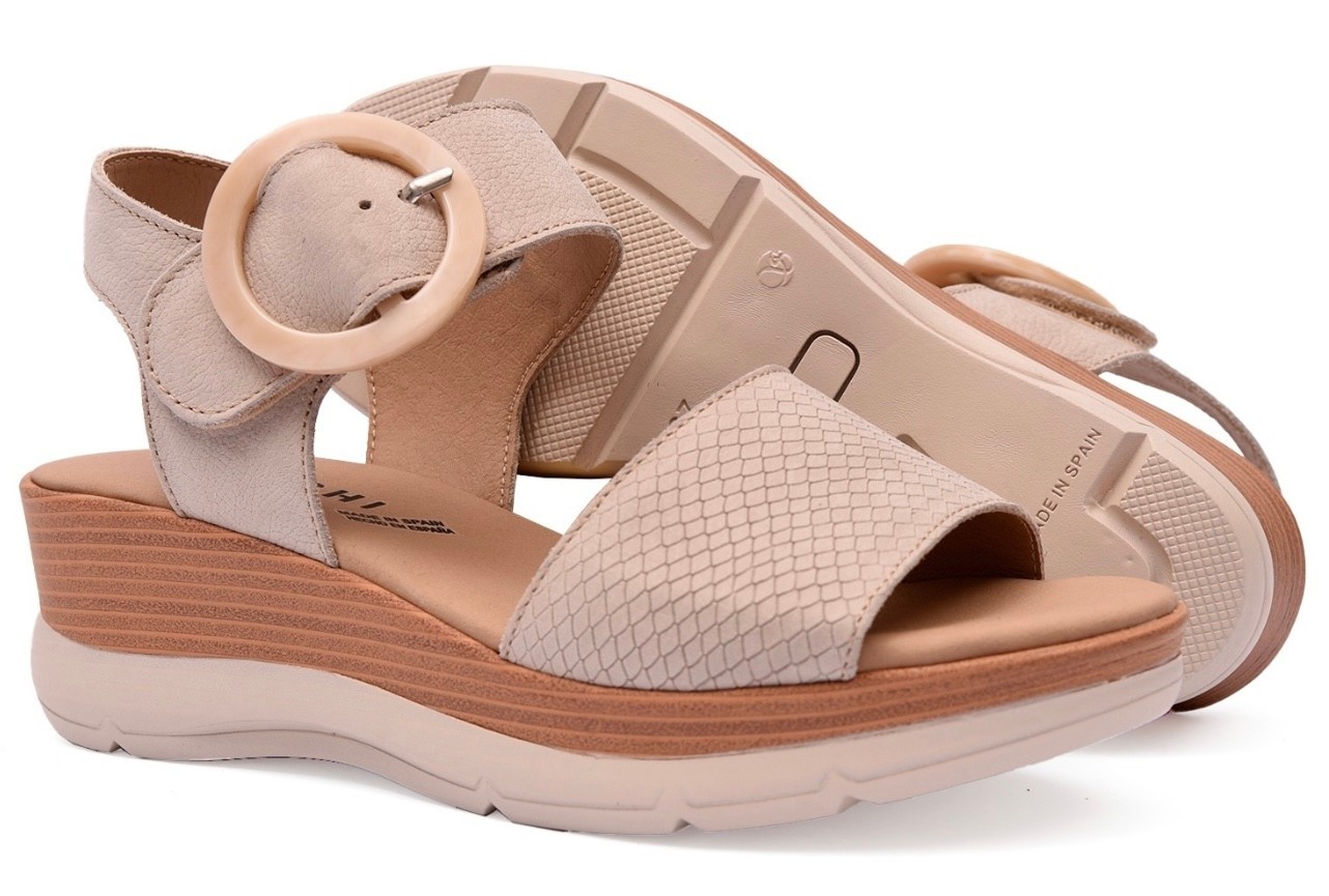 Create an accountComfort Sandal with a strap at the front of the toes and an ankle strap featuring an adjustable velcro closure with a decorative buckle. The insole is soft, providing comfort with every step. The two-tone sole is anti-slip and shock-absorbing, offering comfort and stability with every step.