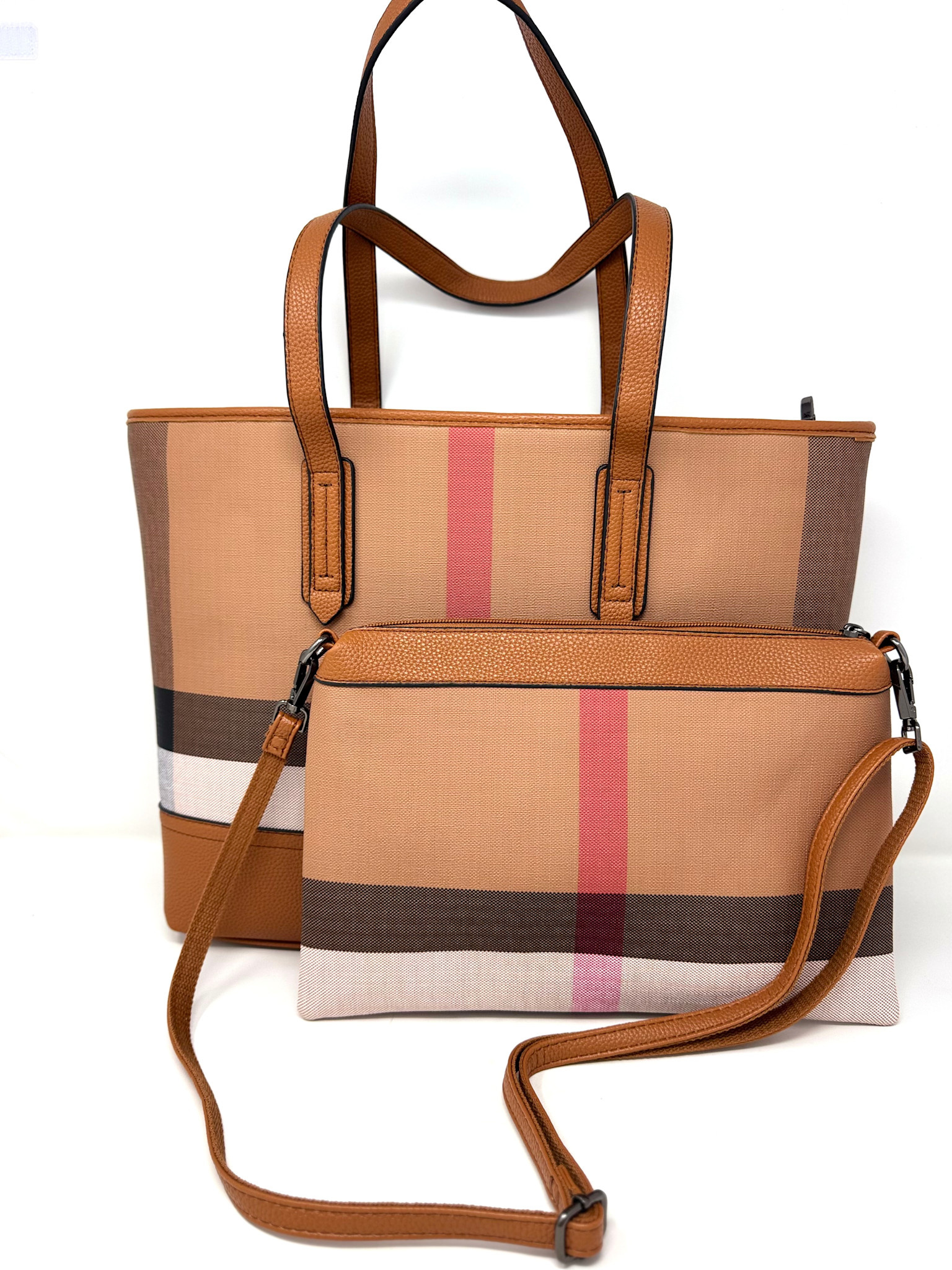 Create an accountA Burberry inspired plaid tote bag large enough for an over night. Use the accompanying purse as a crossbody bag seperatly or use it inside the tote as an organizer.