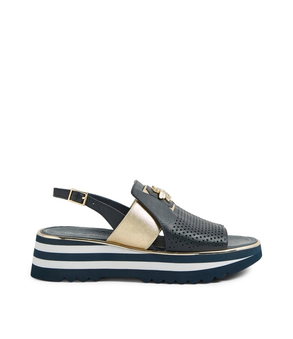 Featuring a black & white platform sole for a modern look, it is highlighted by a gold bee with sparkling details for a chic touch. Perfect for adding elegance to any outfit.