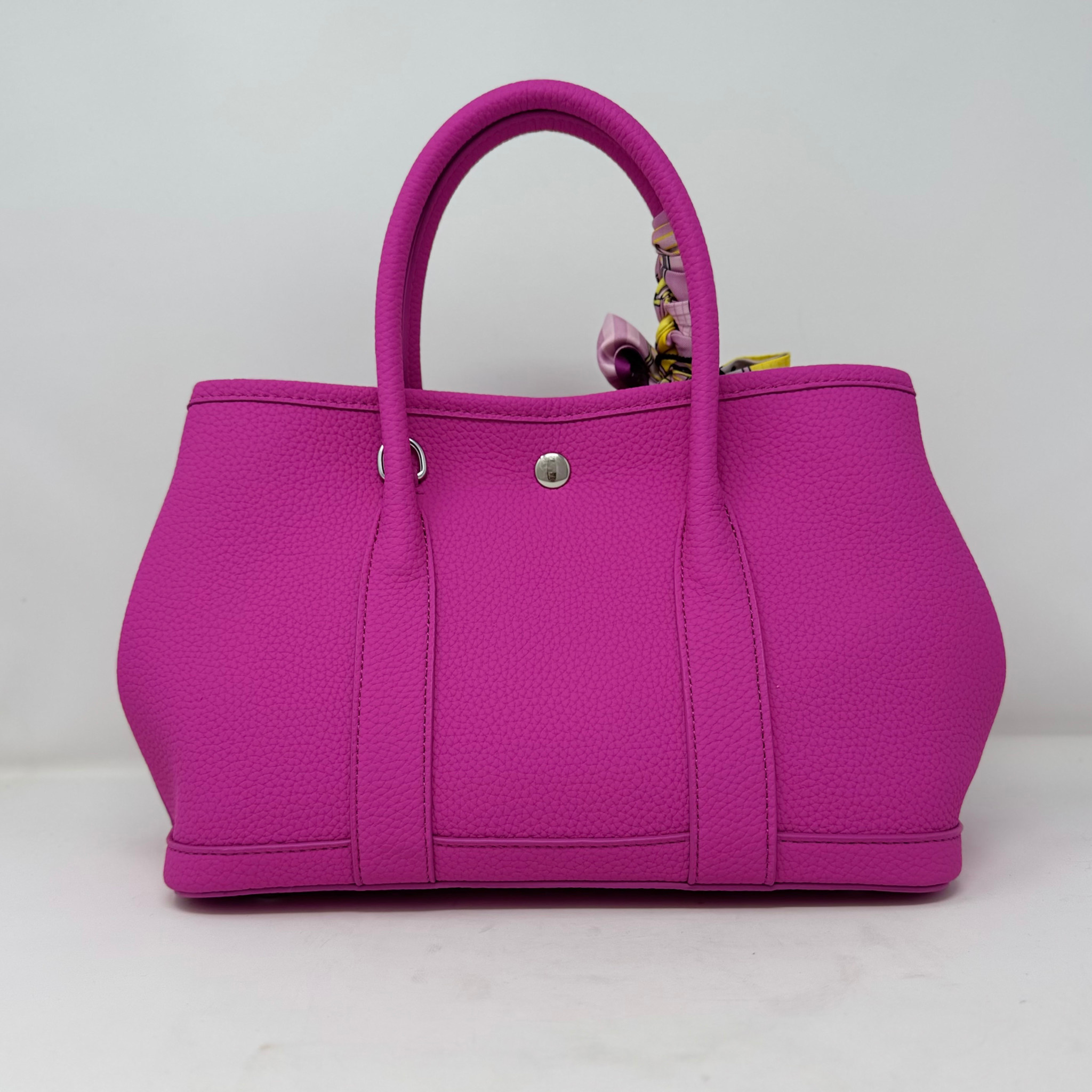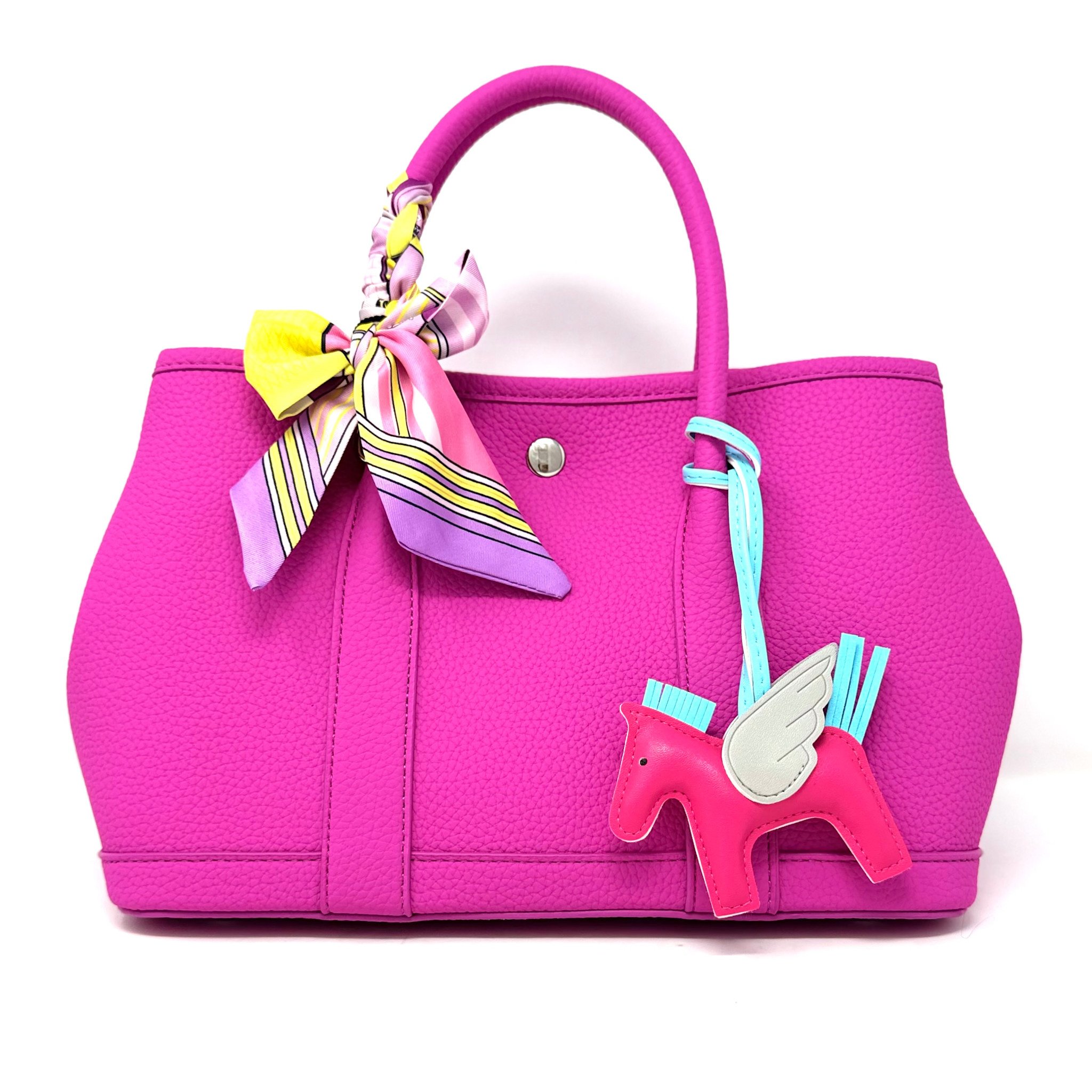 A hot fushia pink handbag with a silk scarf and charm.