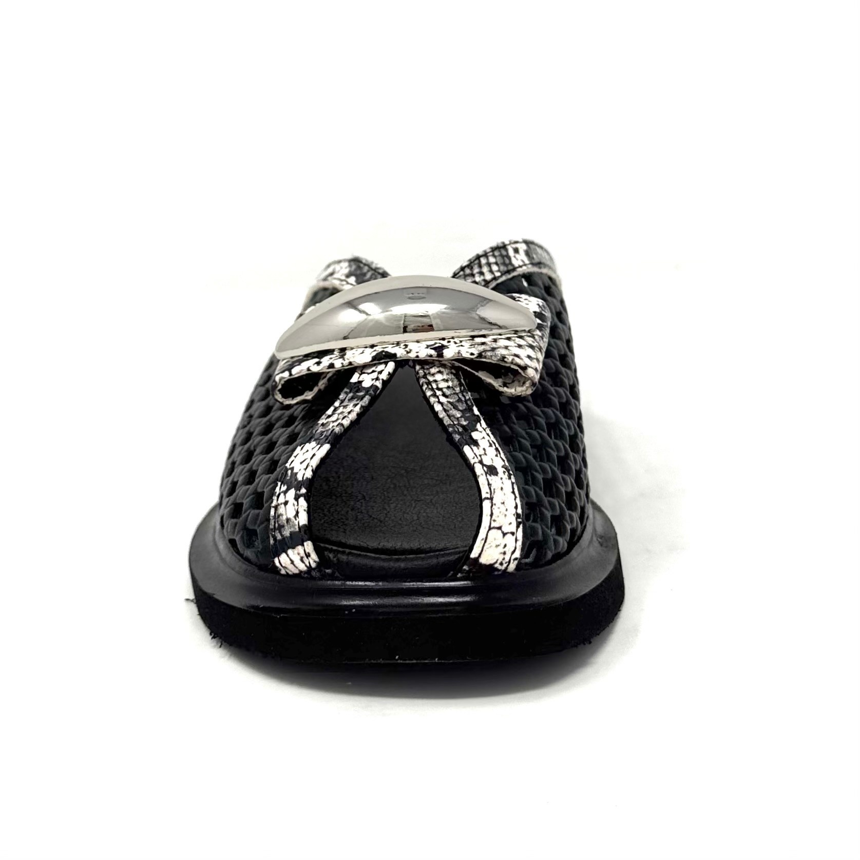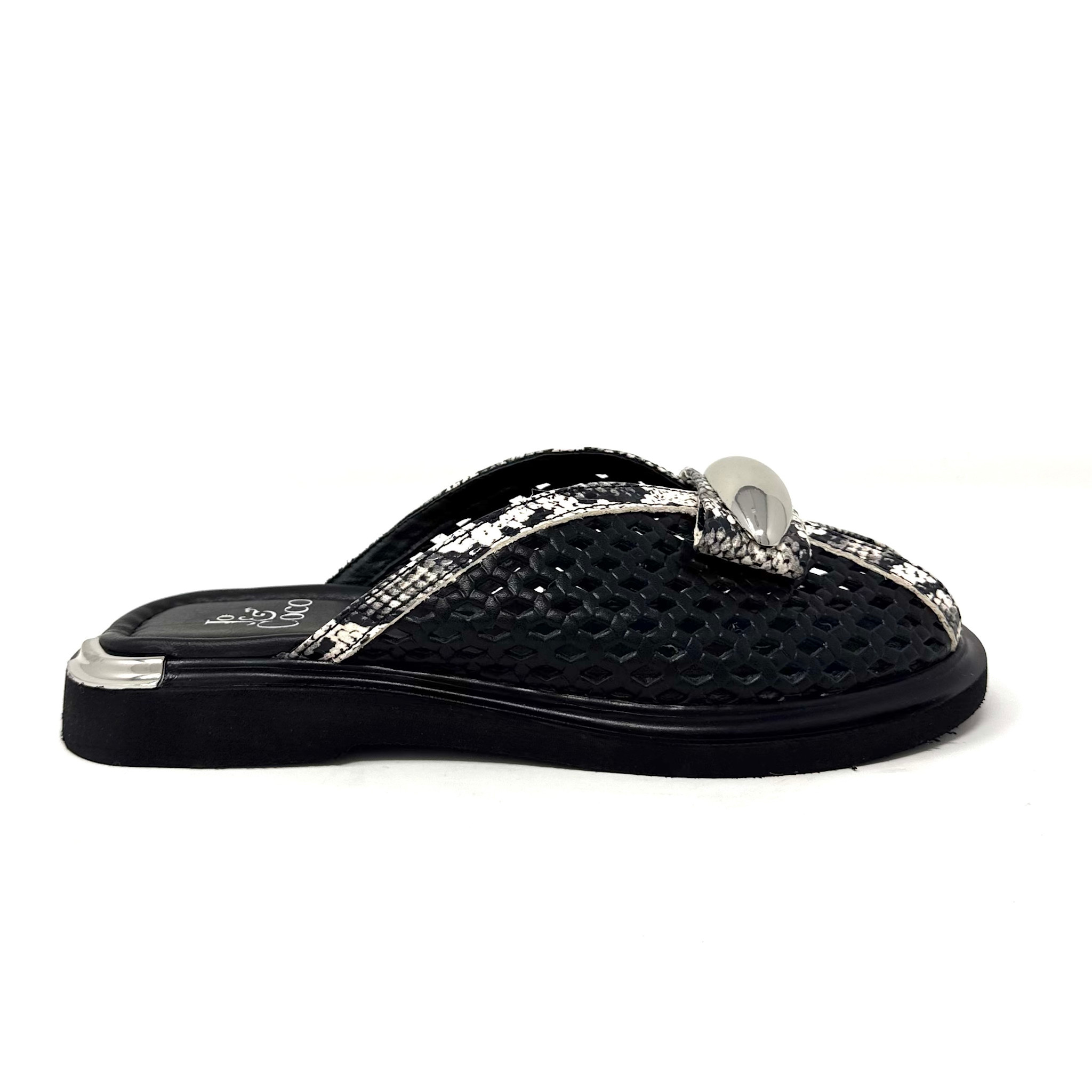Create an accountSuch a unique design on this mesh leather slide that surrounds the foot and leaves a little opening at the toe.