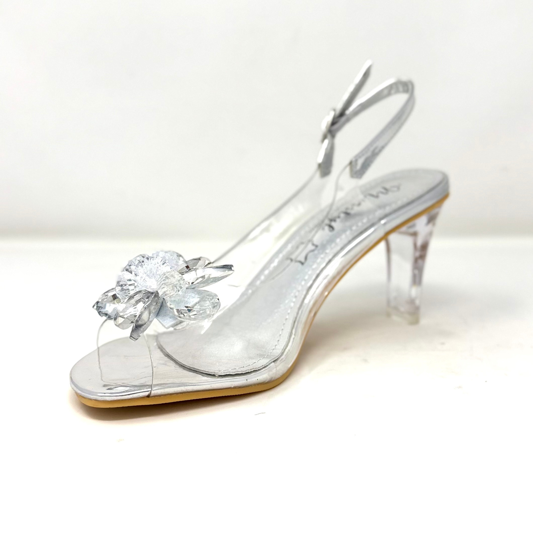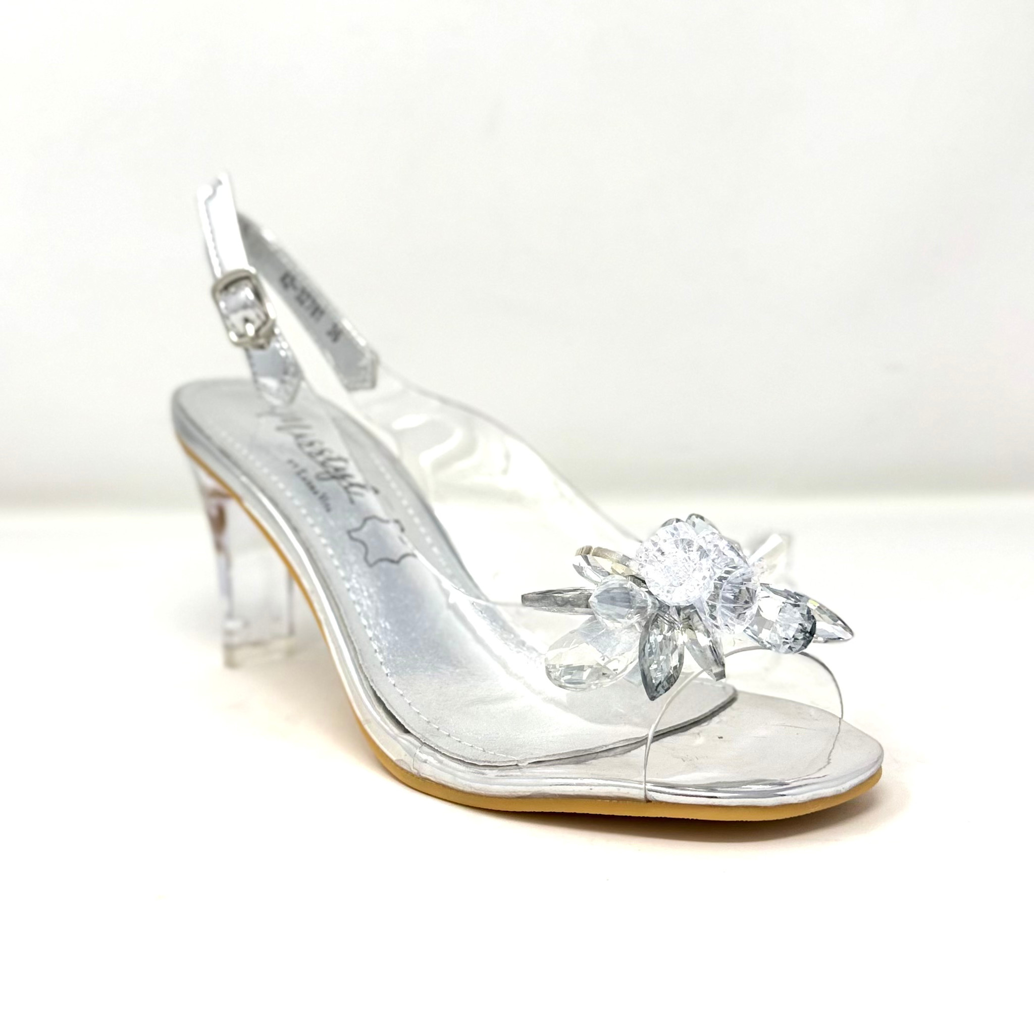 Create an accountThis gold & clear shoe looks fabulous on the foot! Dress up any outfit with this shoe. An adjustable back strap for a perfect fit. Available in silver or gold. The clear lucite heel and pretty flower on top of the toes makes this shoe magical.