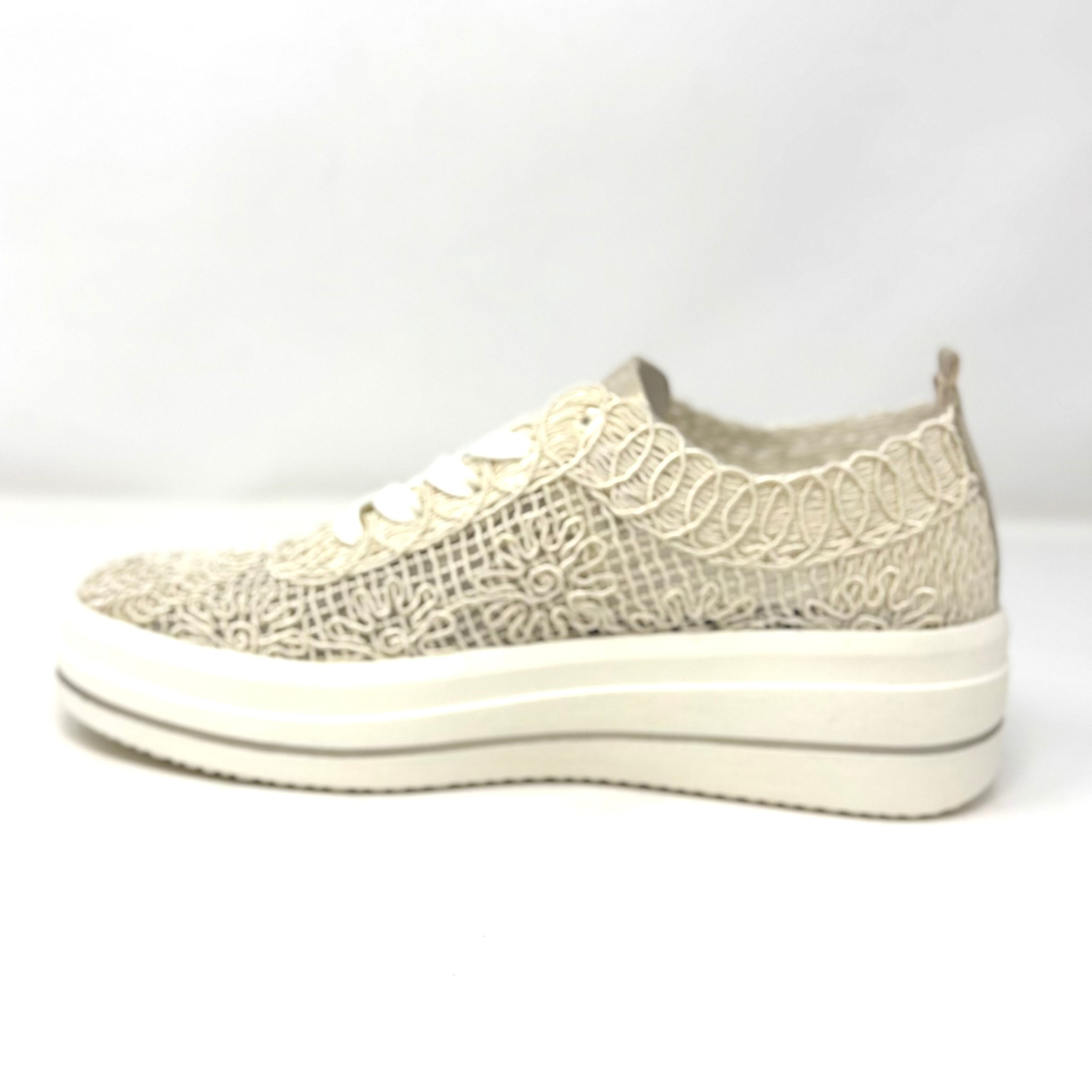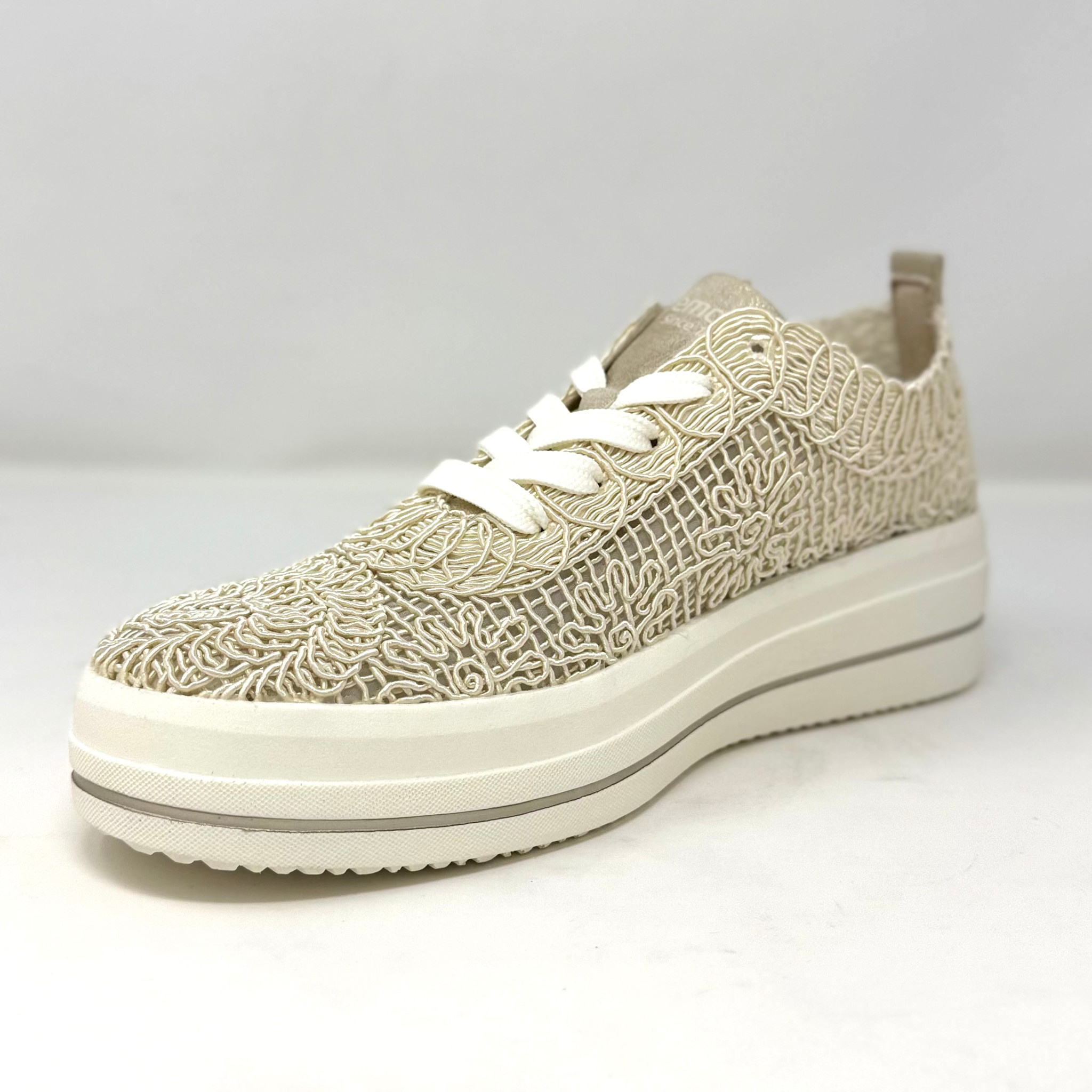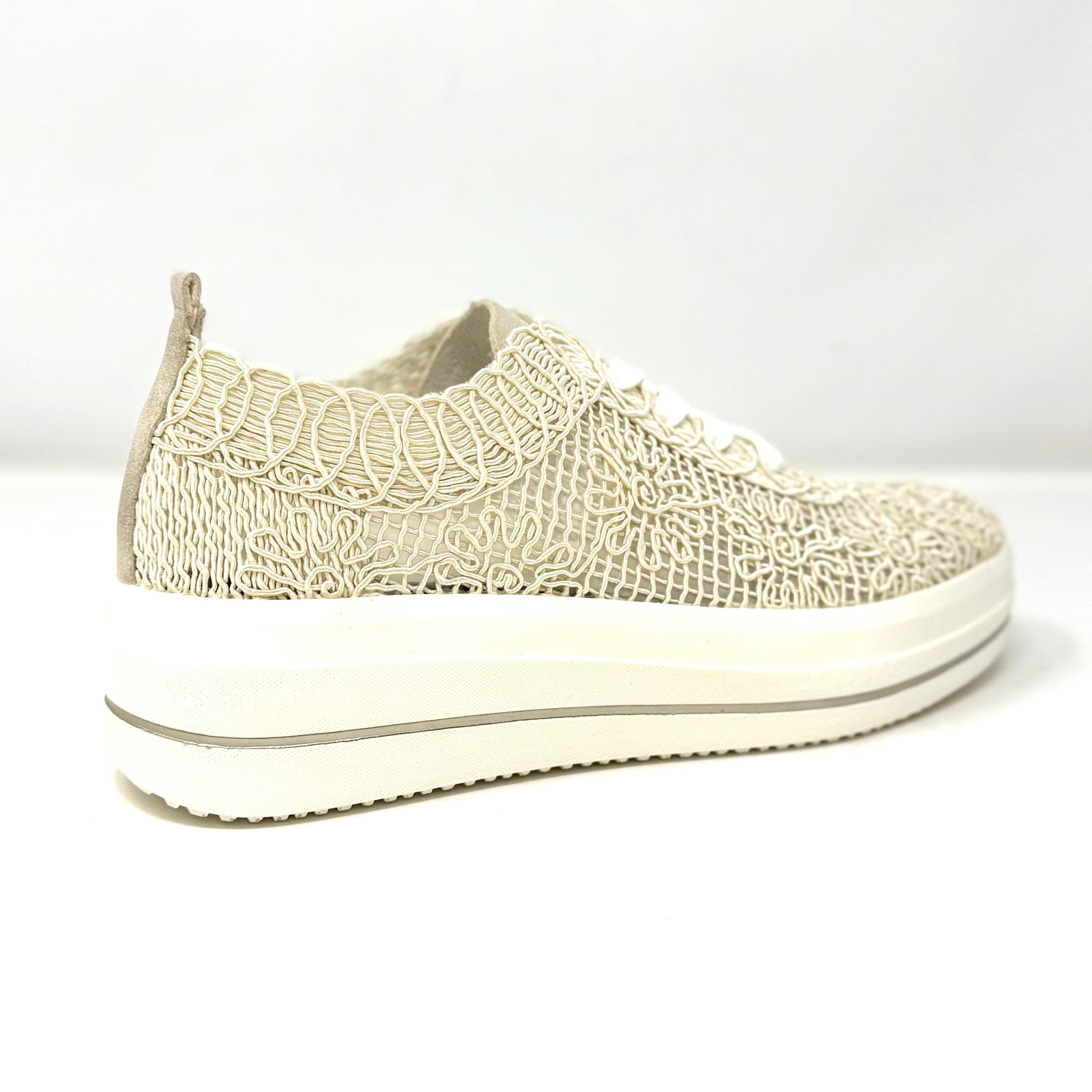 Create an accountA super lightweight and cushiony sneaker with a bit of a lift. The macrame upper is lined. A removable footbed to fit your orthotics. A beautiful soft linen colour on a white sole.