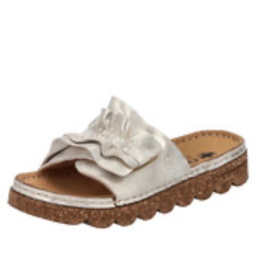 Create an accountFashion meets function. These silver Rieker mules are comfortable companions. The traditional stitchdown construction makes the shoe particularly flexible and robust and ensures a great fit. This shoe is put on in no time thanks to a hook-and-loop fastener. The fashionable ruffles add a fashionable touch to the design. With the light and shock-absorbing sole with wedge heel, a cushioned walking experience is the new standard. Your style, your summer!