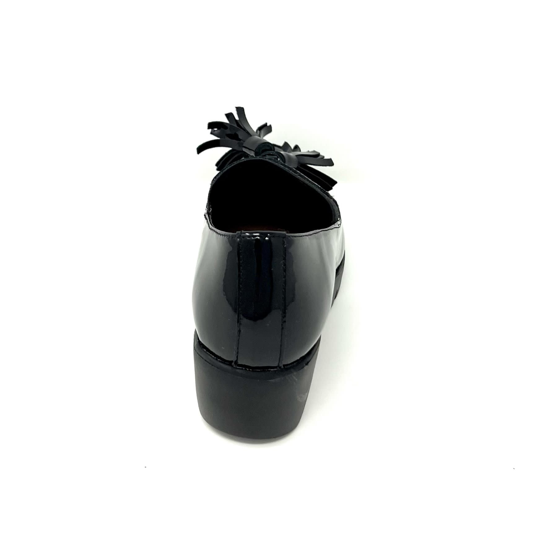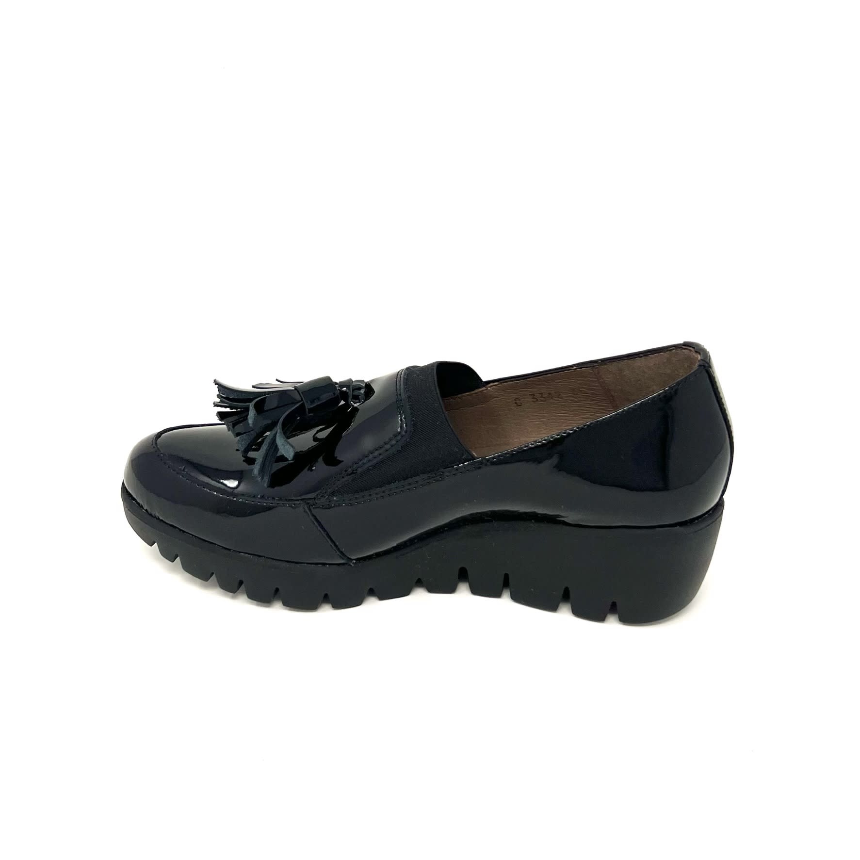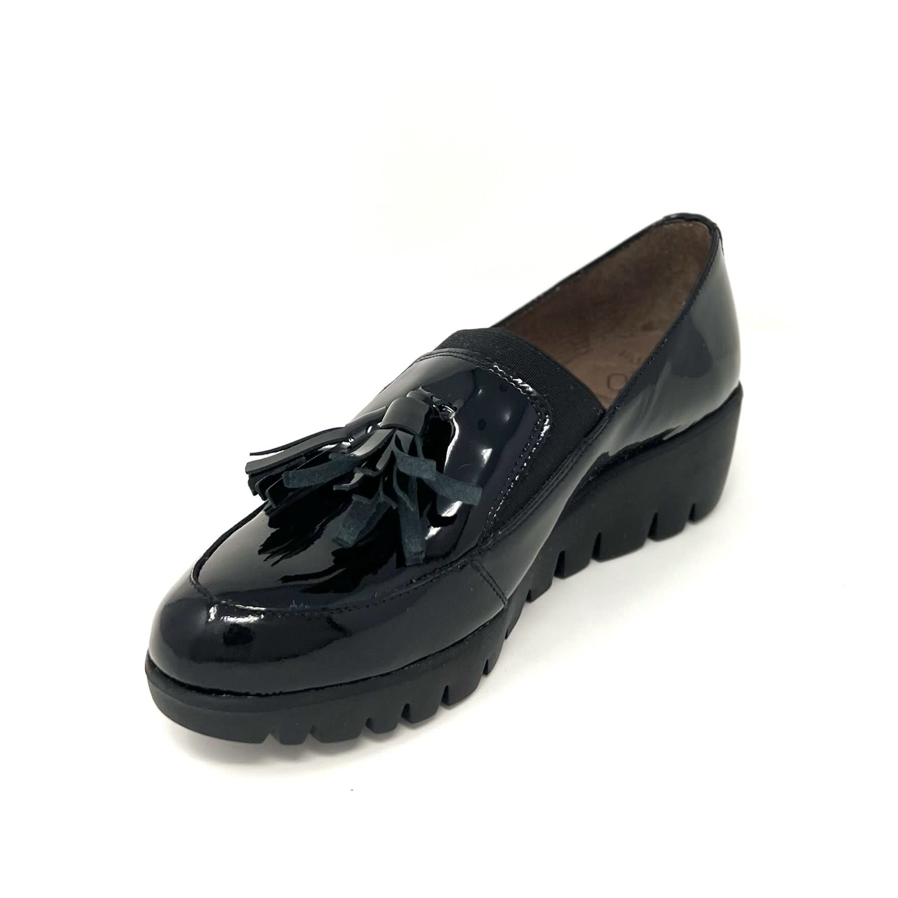 Create an accountBlack patent leather wedge shoes with leather tassels for design. Just enough lift to be all-day wearable.