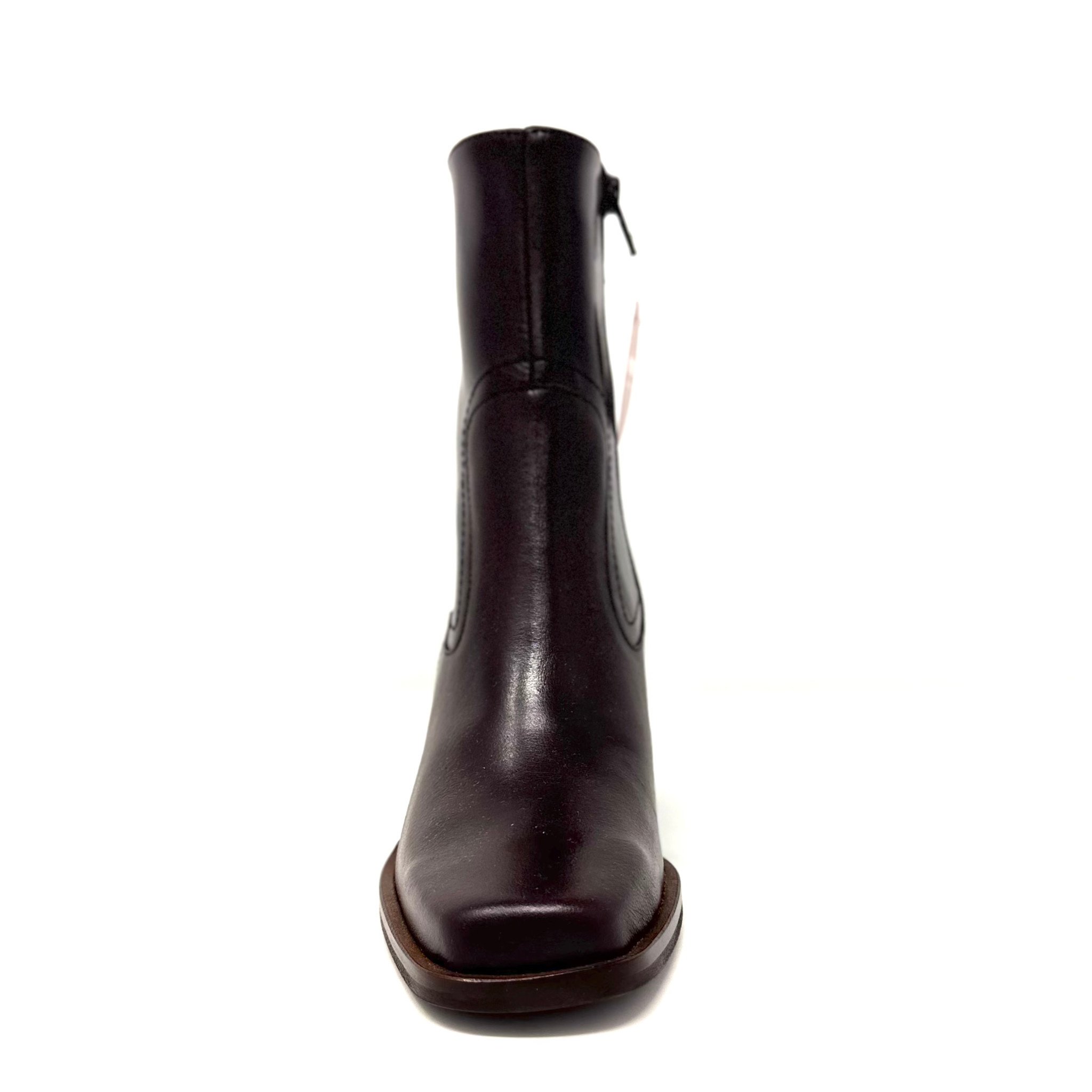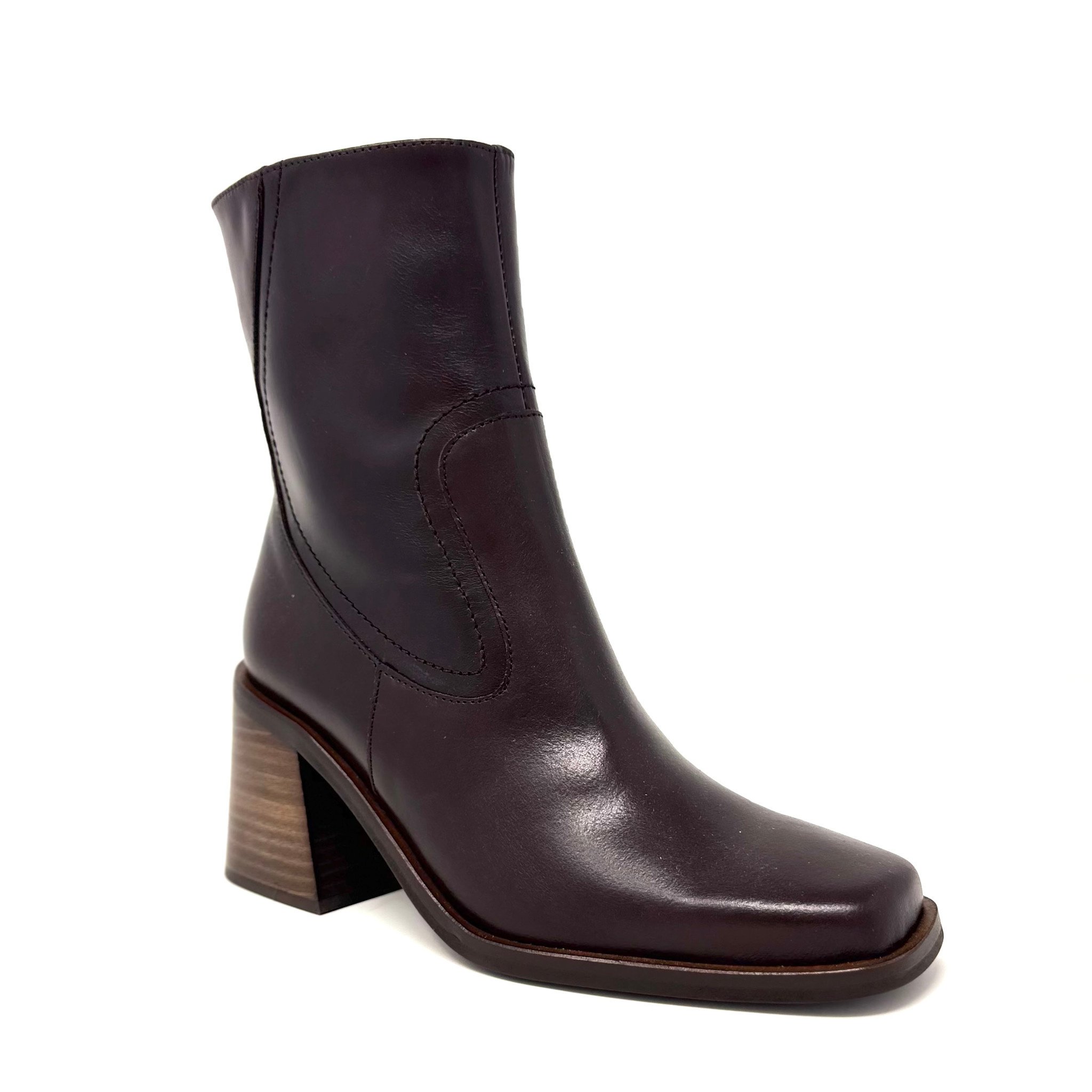 Its defining feature is a chunky, stacked wooden block heel — robust and slightly rustic, adding both height and a grounded feel. The heel’s natural wood grain complements the leather’s finish, giving the boot a warm, artisanal character. A discreet side zipper for ease of wear, and the sole is durable yet refined, perfect for urban strolling or dressing up a casual look.