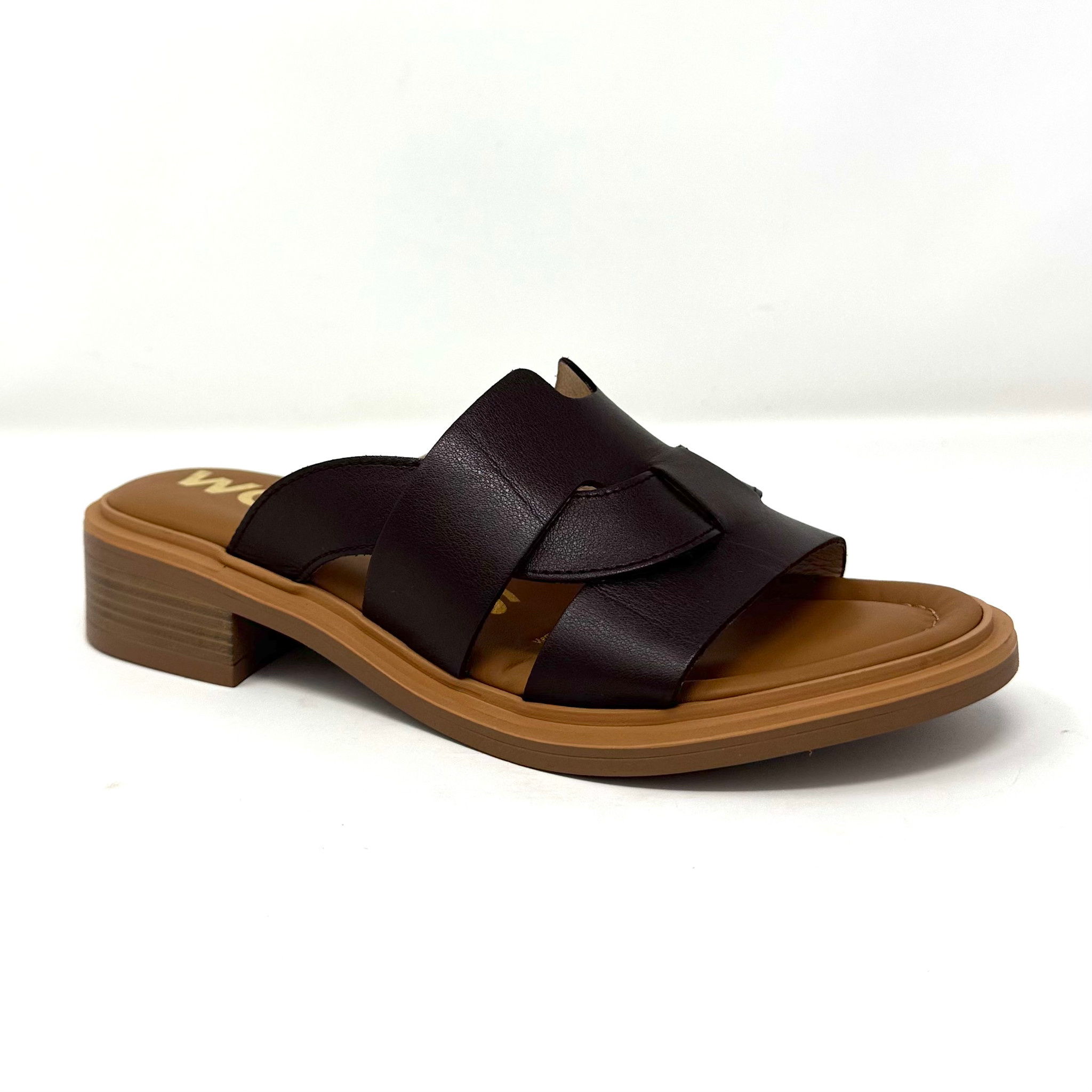 Create an accountA beautiful low square heeled slide with a dressy look. Dark brown braided leather straps over the front of the foot. Made in Spain by Wonders.